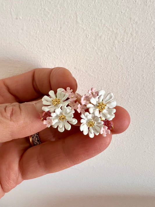 Orecchini a clip con fiori e pietra rosa