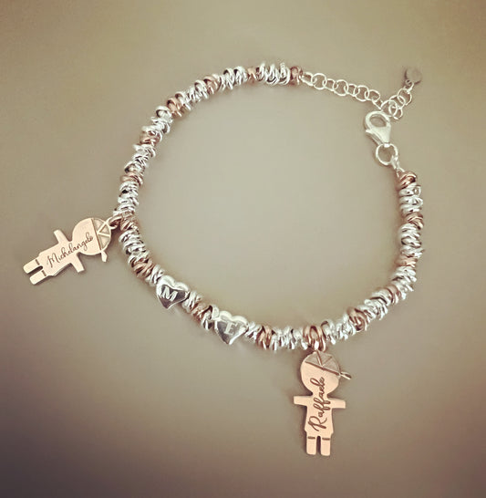 Bracciale famiglia con due cuori iniziale e due bimbi