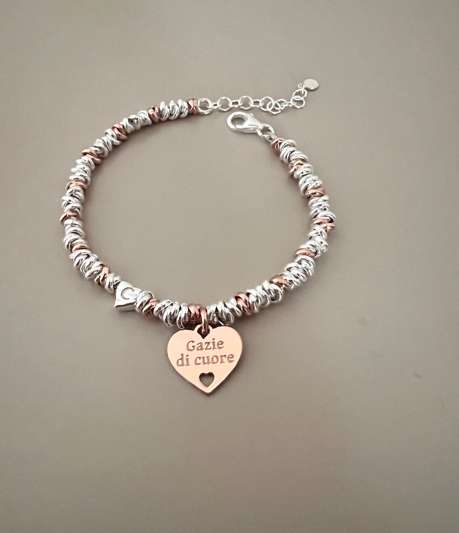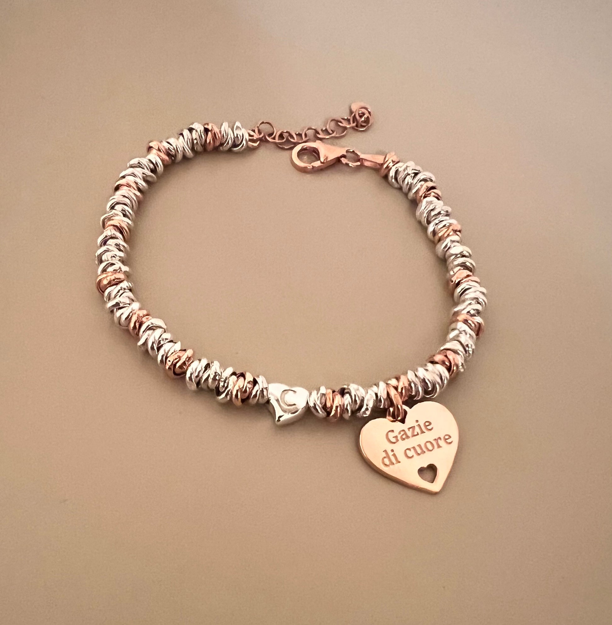 Bracciale in argento 925 bianco e rosato con un cuore bombato al centro e un cuore pendente