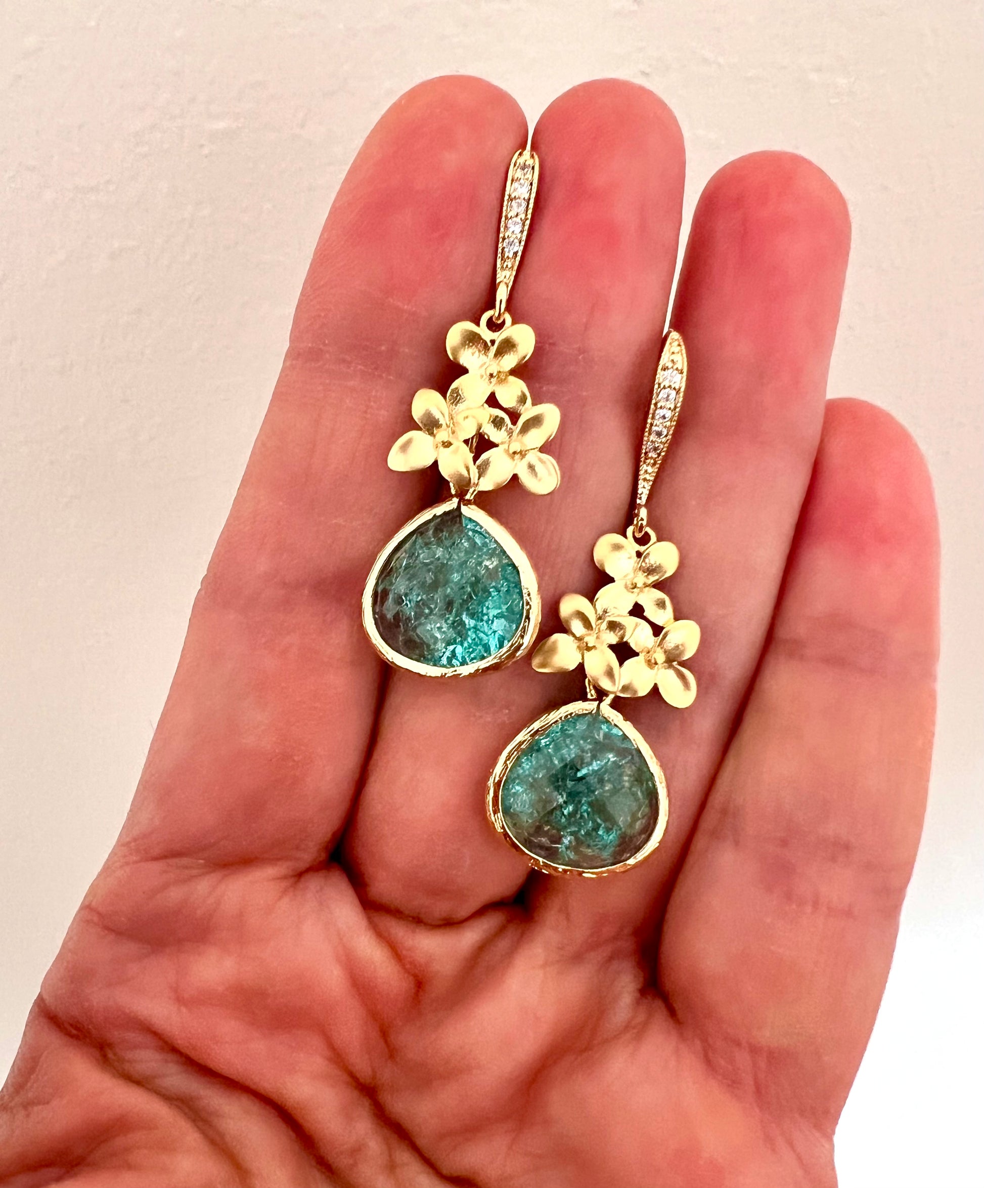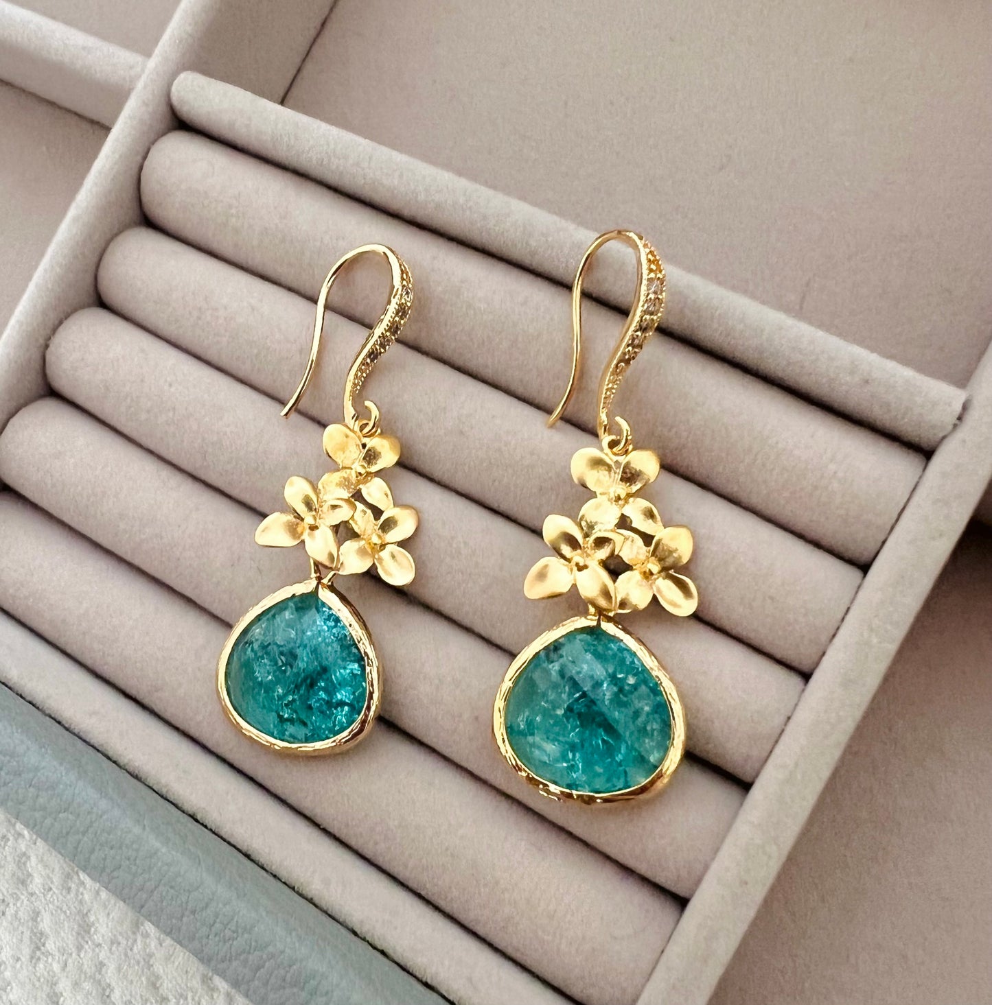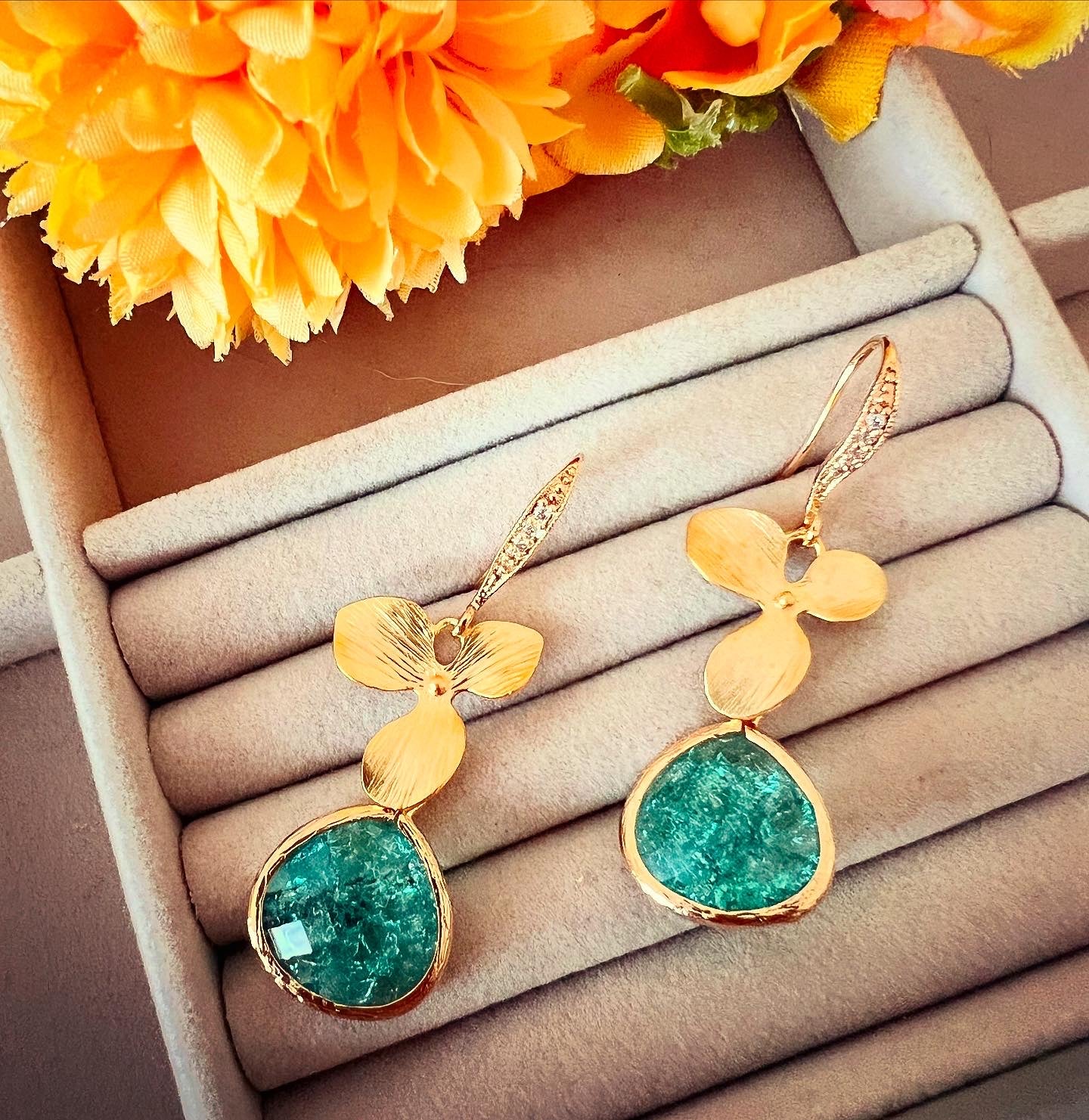 Ottone dorato con gocce di quarzo craquelè verde acqua e micro zirconi